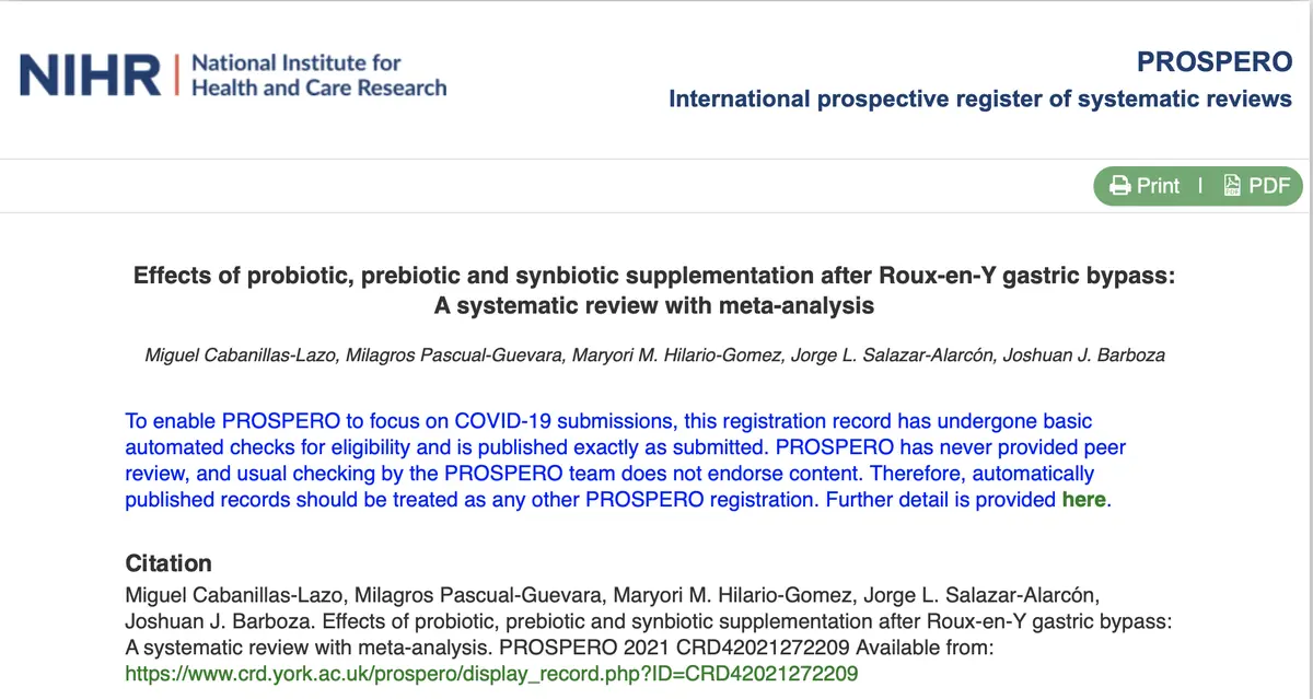 Miguel Cabanillas-Lazo, Milagros Pascual-Guevara, Maryori M. Hilario-Gomez, Jorge L. Salazar-Alarcón, Joshuan J. Barboza. Effects of probiotic, prebiotic and synbiotic supplementation after Roux-en-Y gastric bypass: A systematic review with meta-analysis. PROSPERO 2021 CRD42021272209 Available from: https://www.crd.york.ac.uk/prospero/display_record.php?ID=CRD42021272209